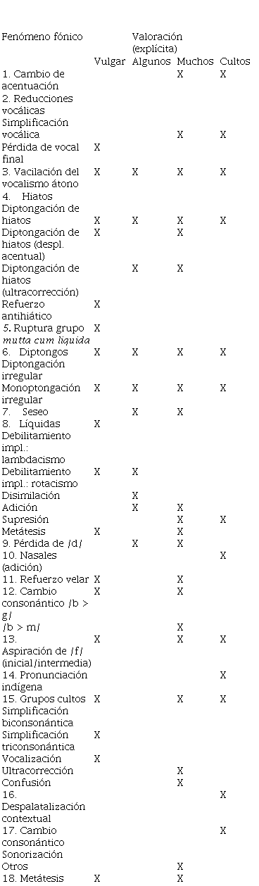 A partir, pues, de lo anterior —y a pesar de que en ocasiones la clasificación de un ejemplo específico no resulte tan clara como sería de desear—, parece posible establecer una distribución social de los fenómenos en cuatro grandes grupos, a saber: a) aspectos estrictamente reducidos a los niveles socioeducacionales más bajos, muchas veces identificados, según se dijo ya, con el vulgo o con el ámbito rural; b) procesos que cuentan con una distribución mayor, habida cuenta de la indicación de Batres Jáuregui de que «algunos dicen», pero sin una referencia explícita a su carácter vulgar; c) cuestiones socialmente más extendidas, que se introducen en los Vicios del lenguaje con expresiones del estilo de «muchos dicen»; y d) características fónicas generalizadas en todos los estratos sociales del país, cuyo uso diastráticamente compartido se evidencia por las alusiones textuales a su empleo por parte de los cultos o incluso de un nosotros que representa al propio Batres Jáuregui como prototipo de tal grupo social. De este modo, la distribución de los rasgos fónicos descritos de acuerdo con esta taxonomía —que en cierto modo se puede interpretar como un continuum de su alcance social: vulgar > algunos > muchos > todos (cultos)— permite establecer la tabla que se presenta a continuación: