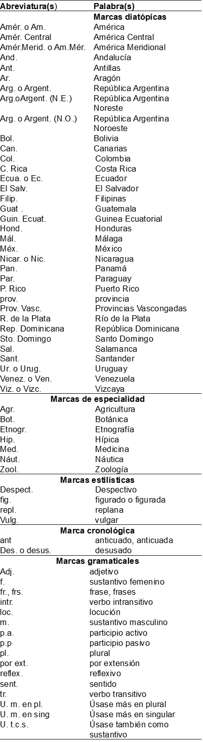 Según se observa en la Tabla 1, hay ciertas precisiones a considerar respecto a la parte de las marcas presentadas en el DP 2009. Primero, no hay abreviaturas de marca diatópica para Chile ni Perú, pues, como en otros diccionarios, Álvarez Vita usa la forma extendida de ambos nombres propios según se requiera. Segundo, en las marcas estilísticas no se registran fam. (familiar), jerg. (jerga), malson. (malsonante), a pesar de que están en el desarrollo del diccionario. Por último, las marcas gramaticales deberían incluir Afér. (aféresis), que aparece en un par de definiciones del DP 2009, y V. (véase).