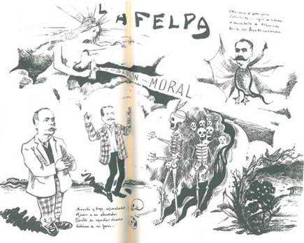 Un carácter importante de la denuncia que se realiza en La Felpa está asociado con la información que se manejaba en el espacio público. Como se ha mostrado en otras ilustraciones, La Felpa fue consistente en señalar los excesos cometidos por Arana y otros patrones caucheros. En la Figura 6, se recoge nuevamente una alegoría de los espectros, Arana y las instituciones de la nación peruana.