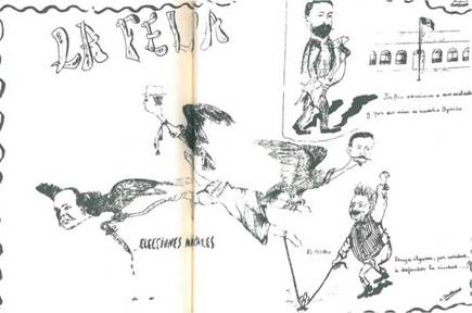 Como comentamos al inicio de este estudio, nos interesa incorporar el análisis de las caricaturas de La Felpa. Suelen presentar una imagen central de contenido satírico, y van acompañadas al borde de dibujos que promocionan negocios y productos de la ciudad de Iquitos de aquellos años —una tienda de productos chinos en el malecón, tiendas de licores, billares y casas comerciales entre las promociones más recurrentes—. Estas imágenes acompañan todas las caricaturas centrales en los números de La Felpa.