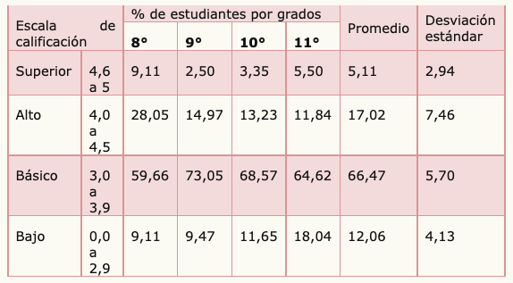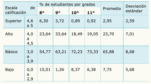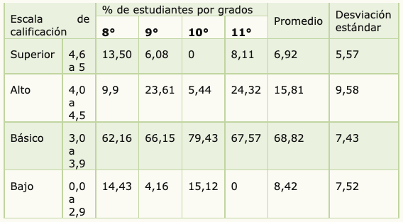 Las tablas 1 a 5 muestran los resultados del rendimiento académico durante el año 2016 en las asignaturas de matemáticas, ciencias naturales, español e inglés.
