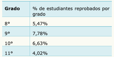Los grados 8°, 10° y 11°, pasaron de reprobación de un año escolar a reprobar solo las asignaturas pérdidas, esto llevó a reducir la perdida de curso en más del 50% de los casos, a excepción del grado 9° que presentó un leve aumento de 0,78% (ver tablas 5 y 10). El 83% de los estudiantes atribuye la causa de esta situación a las pocas materias que estudian por semestre, sumado a la promoción por avance en plan de estudio, lo que facilita el adelanto de asignaturas de otros semestres, en aquellos casos que se tiene que repetir alguna materia. Numerosos estudios muestran que una de las razones de la pérdida de cursos eran dificultades académicas (Universidad Nacional, 2010) y reprobación de materias (ENDE, 2012). Estas son variables que es posible atenuar, empleando dentro de la autonomía escolar (Colombia. Congreso de la República, 1994, artículo 77) otros tipos de prácticas mesocurriculares, que permitan dinamizar el proceso enseñanza aprendizaje.