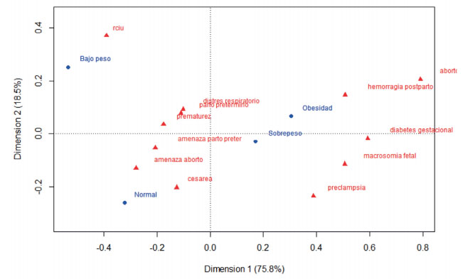 El análisis de correspondencias muestra que la restricción del crecimiento intrauterino está asociada con mayor fuerza al estado nutricional de bajo peso de la madre; la obesidad se vio relacionada mayormente con hemorragia postparto, distrés respiratorio, parto pretérmino y diabetes gestacional, información que coincide con lo observado en el estudio de Cajas (2015), donde las complicaciones más frecuentes en mujeres embarazadas fueron los trastornos hipertensivos, la diabetes gestacional y la macrosomía fetal; el sobrepeso, relacionado con diabetes gestacional, macrosomía fetal, preeclampsia, parto pretérmino y distrés respiratorio; finalmente en el estado nutricional normal se observa una mayor asociación con cesáreas, amenaza de aborto y amenaza de parto pretérmino.