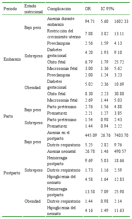 Las complicaciones asociadas significativamente con el estado nutricional de la madre durante el embarazo fueron: en las mujeres con bajo peso, en relación con el estado nutricional normal, restricción del crecimiento intrauterino (OR = 7.08) y anemia durante el embarazo. Las mujeres con sobrepeso, en relación con el estado nutricional normal, diabetes gestacional (OR = 4.20), óbito fetal (OR = 6.79), macrosomía fetal (OR = 3.00), y preeclampsia (OR = 2.56); las mujeres con obesidad, en relación con el estado nutricional normal, diabetes gestacional (OR = 5.02), óbito fetal (OR = 8.30), macrosomía fetal (OR = 3.00) y preeclampsia (OR = 2.00).