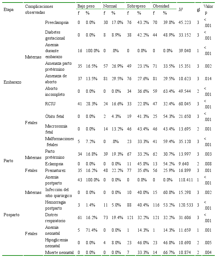 Las complicaciones en el posparto, asociadas significativamente al estado nutricional de la madre fueron: en el grupo con bajo peso en relación con el estado normal, anemia de la madre en el postparto (OR = 445.09), distrés respiratorio (OR = 5.25) y anemia neonatal (OR = 26.78). En el grupo de sobrepeso en relación con el estado nutricional normal, hemorragia posparto (OR = 9.69), distrés respiratorio (OR = 1.73) e hipoglucemia del neonato (OR = 4.58). En el grupo de obesidad en relación con el estado normal, hemorragia postparto (OR = 13.58), distrés respiratorio (OR = 1.44) e hipoglicemia del neonato (OR = 4.16).