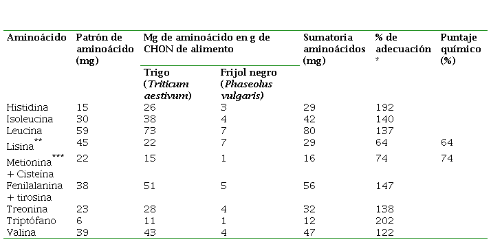 En la Tabla 1 se presenta el PQ de la mezcla vegetal en proporción 90:10 de harina de trigo (Triticum aestivum) y harina de frijol negro (Phaseolus vulgaris) establecida. Se observa que la calidad proteica mejoró al complementar la lisina y metionina+cisteína, obteniendo un puntaje químico de 64% y un 74% respectivamente.