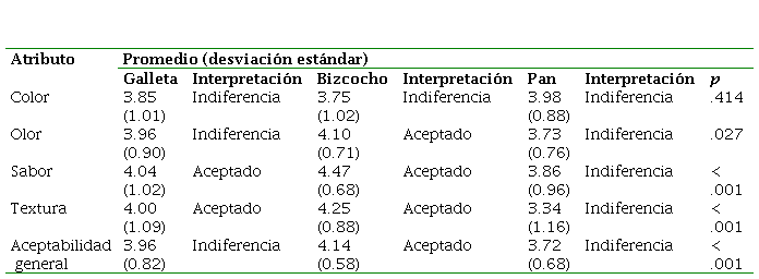 En la Tabla 2 se observa que la clasificación del color fue de indiferencia y sin diferencia significativa para todas las preparaciones. El bizcocho fue el único aceptado en olor, mientras que el sabor y textura de la galleta y bizcocho fueron aceptados. Finalmente, el bizcocho fue el producto más aceptado y con diferencia significativa respecto a las otras preparaciones.