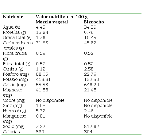 Finalmente, la Tabla 3 presenta que en 100 g de la mezcla vegetal en estudio hay 13.94 g de proteína y 71.95 g de carbohidratos, en 100 g de bizcocho hay 6.78 g de proteína y 45.82 g de carbohidratos. Además, en 100 g de la mezcla vegetal hay 7.22 mg de sodio y 416.31 mg de potasio, en 100 g de bizcocho hay 512.62 mg de sodio y 132.30 mg de potasio.