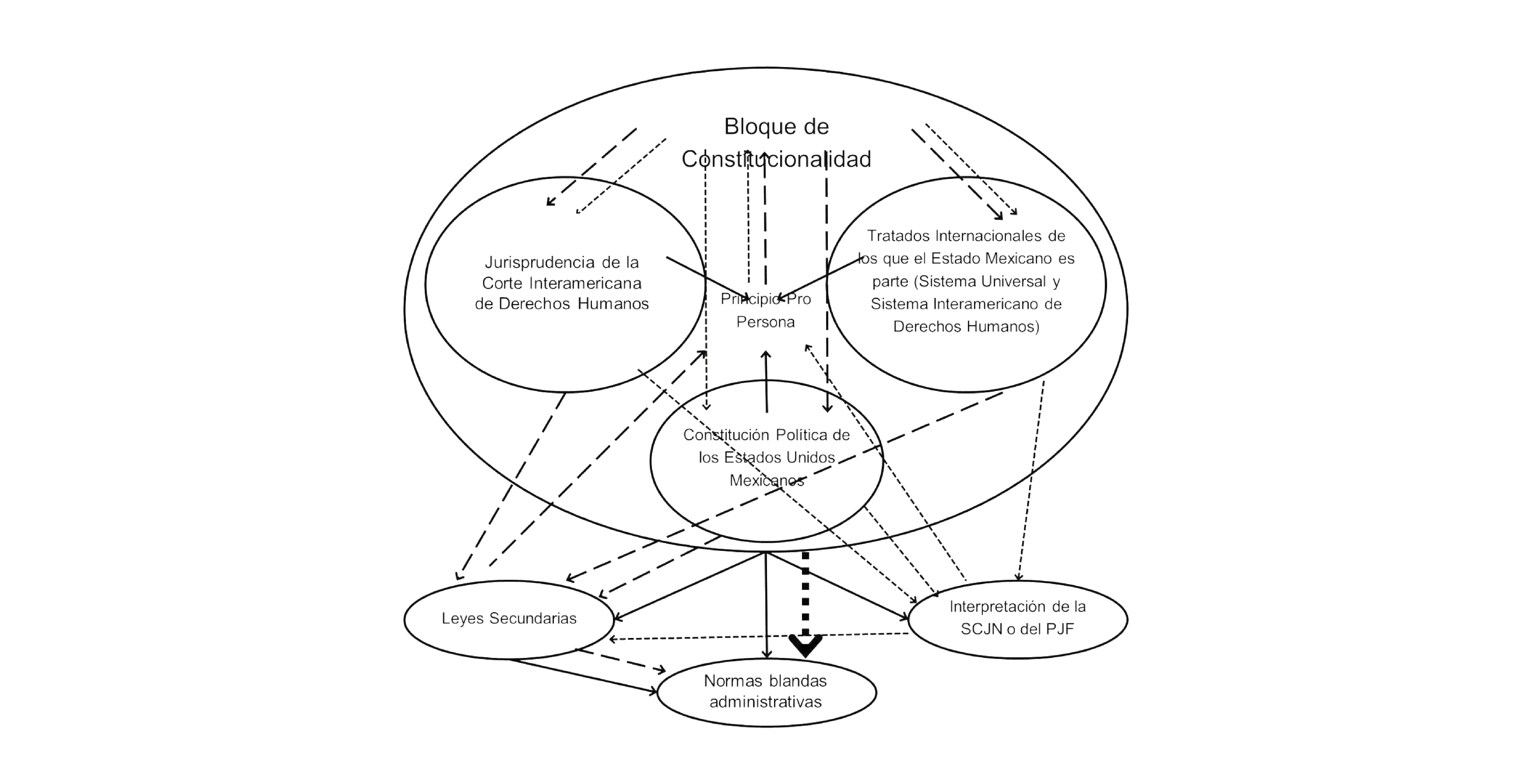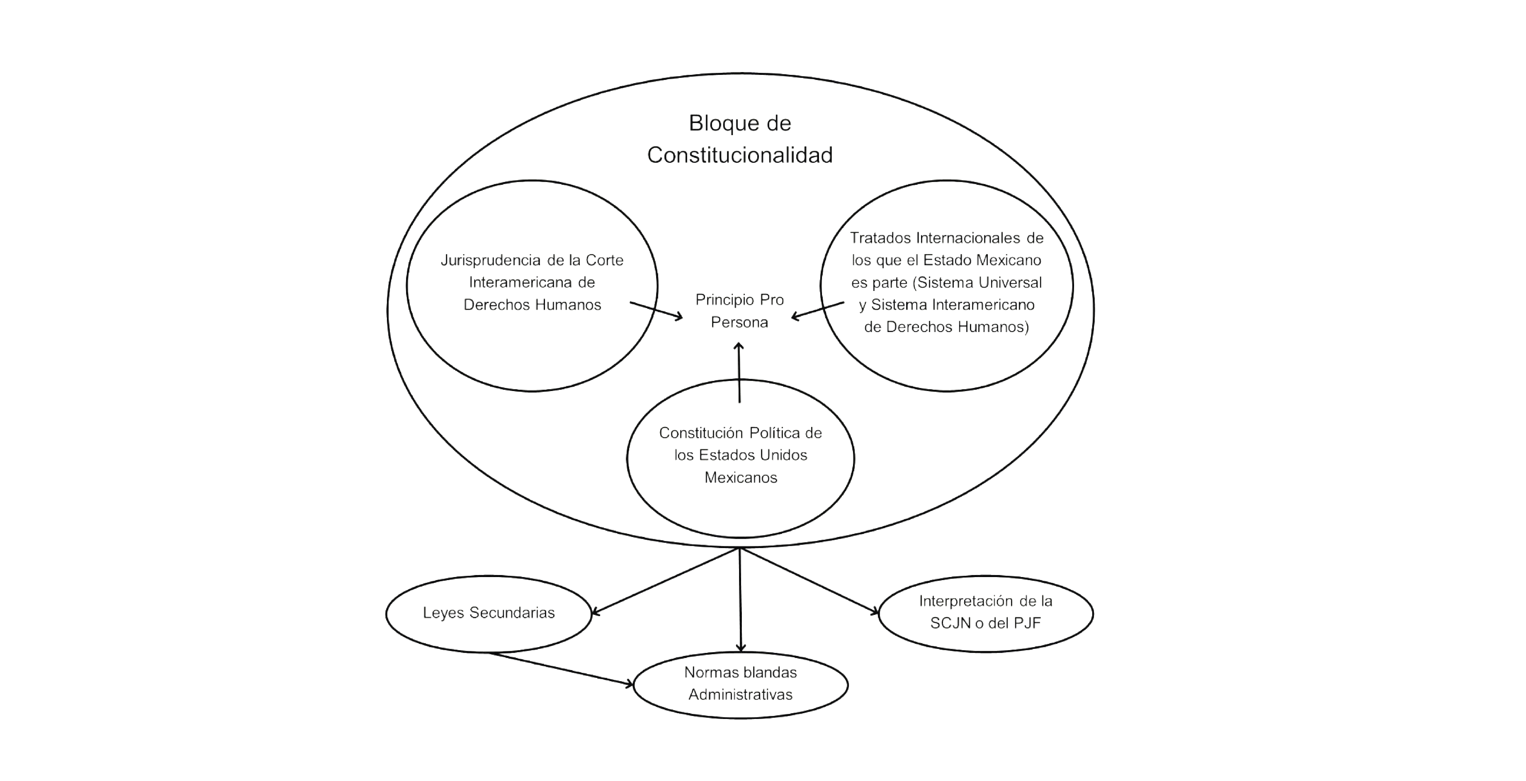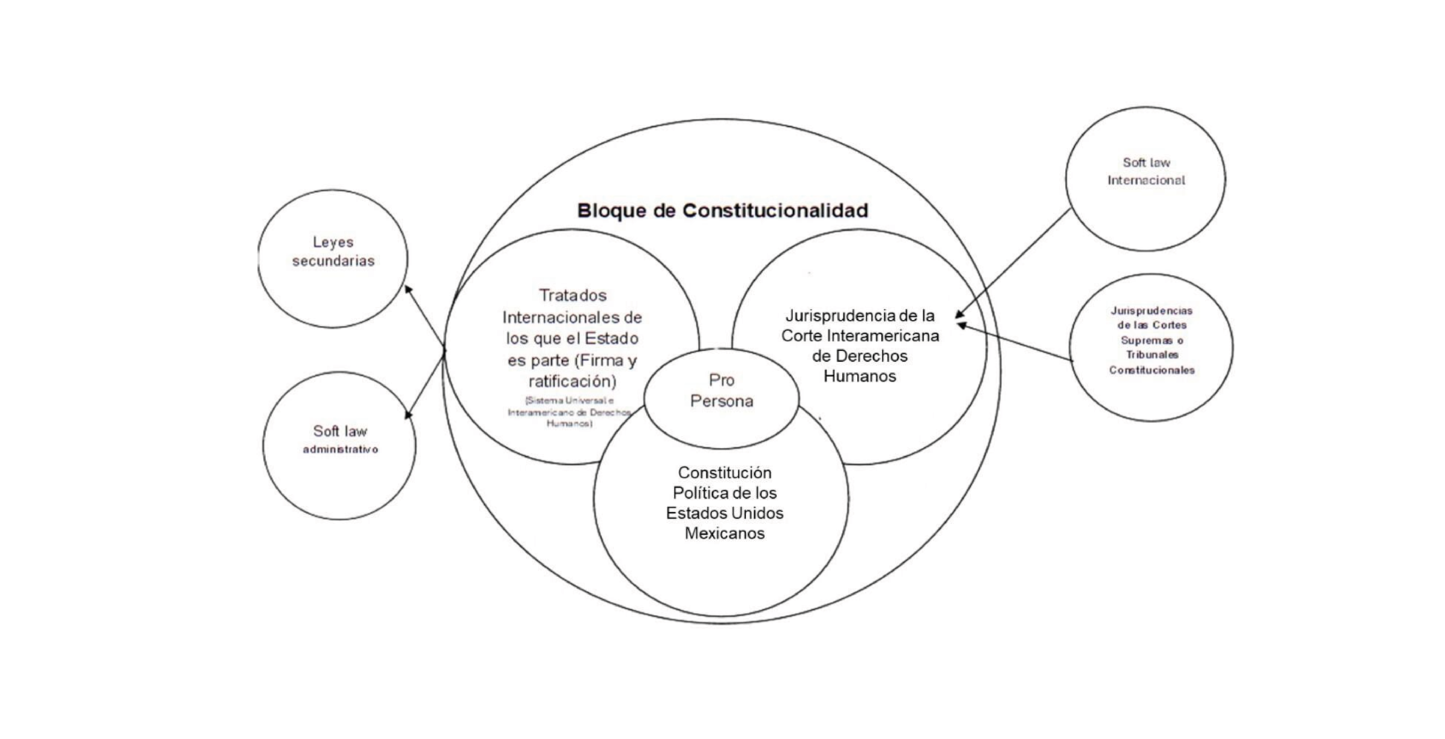 Como se observa en la figura, la operatividad de las normas jurídicas, de las interpretaciones de los Tribunales Constitucionales o Cortes Supremas de los Estados y a cualquier norma administrativa en materia de Derechos Humanos, están supeditadas al Bloque de constitucionalidad, lo que implica que cualquier controversia jurídica en este ámbito debe ser analizada con el mismo. Esto permitirá que dicho bloque sirva de base para la aplicación operativa de protección de Derechos Humanos utilizando como herramienta principal el principio Pro Persona.
