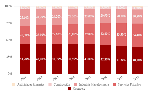 Según la Fundación del Banco Municipal de Rosario (2017), la ciudad “es el núcleo central de la producción agrícola argentina. La estructura de crushing4 aledaña a la urbe es la más importante del mundo por su grado de concentración, tanto en lo referido al procesamiento -plantas-, como al despacho -terminales portuarias-, la capacidad teórica de molienda diaria de cada fábrica (promedio de 8.000 tn/diarias), y la capacidad conjunta (159.000 tn/diarias). En este sentido, en un radio de 300 kilómetros a la redonda se encuentra 35% de la superficie sembrada de granos del país y 41% de la producción total. Desde la denominada zona up-river, una franja que aloja una veintena de terminales portuarias sobre el río Paraná […], se produce más de 85% de las exportaciones de granos, subproductos y aceites del país. La ciudad produce aproximadamente 40% del Producto Bruto Geográfico de Santa Fe, siendo un eje dinámico en lo que a actividad económica refiere, con sectores clave tales como el comercio y los servicios, y estratégicos, como la industria manufacturera. Dentro de este último sector, se destacan las actividades ligadas a la metalmecánica, los alimentos y el área tecnológica”.5 En el gráfico se muestra el porcentaje de implicancia de las actividades económicas que se desarrollan en el Gran Rosario.
