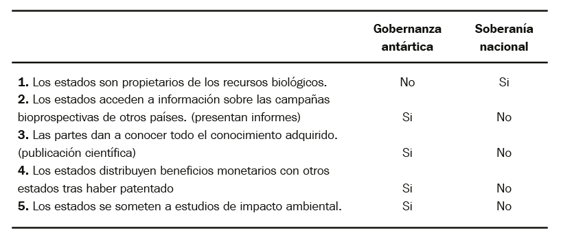 En lo que respecta a la propiedad o permisos de explotación de estos recursos biológicos, el Convenio sobre la Diversidad Biológica de 1992 sostiene que son los estados quienes poseen derechos soberanos sobre los mismos dentro de su territorio. Sin embargo, la compleja cuestión territorial y la carencia de normas específicas sobre la bioprospección en la Antártida provocan un fuerte desconcierto en la gobernanza antártica en torno a cinco ejes principales: 1) propiedad de recursos genéticos, 2) acceso al conocimiento, 3) acceso a la información, 4) impacto ambiental y 5) distribución de beneficios monetarios entre actores (Hughes y Bridge 2010). Este escenario permite actualmente que los estados miembros, y en particular los que disponen de mayores recursos tecnológicos y financiamiento, se apropien de material biológico (sin la necesidad de reportar ni intercambiar información con el resto de estados signatarios) y obtengan posteriormente regalías por la comercialización de sus aplicaciones industriales. Esto representa un grave problema para la gobernabilidad del continente dado que puede provocar que los estados (asociados con actores empresarios, universidades o institutos de investigación) compitan entre sí por la obtención de recursos biológicos, desencadenando tensiones entre las partes, particularmente con aquellos que reclaman soberanía.