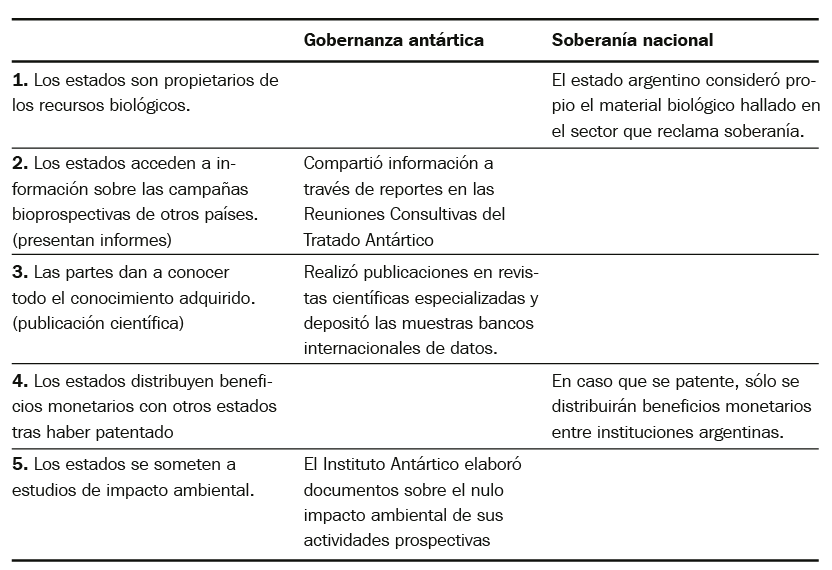 En este sentido, el estudio del caso Genoma Blanco evidencia cómo el estado argentino combinó aspectos de soberanía nacional con adecuación a las normas del Tratado Antártico y las Resoluciones aprobadas por la gobernanza antártica (Cuadro 2). En términos de política interna, el proyecto Genoma Blanco fue utilizado como un ejemplo exitoso de soberanía científica y tecnológica implementado en el sector antártico sobre el cual se reclama soberanía. Así mismo, se intentó demostrar la viabilidad de consorcios público–privado a través del hallazgo de una nueva bacteria bautizada Bizionia argentinensis y su posterior secuenciación genómica realizada por primera vez en el país por investigadores argentinos. En simultáneo y en contraposición, el proyecto fue reportado a las partes consultivas en sus diversas etapas (2006, 2009, 2011 y 2013) intercambiando información, cooperando científicamente e instando al resto de las partes a debatir. En efecto, los resultados de la investigación fueron publicados en revistas científicas especializadas, reportados en las Reuniones Consultivas, y tanto la bacteria descubierta como la secuenciación genómica realizada, depositados en bancos internacionales de datos, dando cumplimiento a los artículos vinculados al intercambio y cooperación científica. En lo referido al impacto ambiental de la actividad, el Instituto Antártico Argentino argumenta que las muestras tomadas de microorganismos tienen un nulo impacto en el ecosistema antártico y, que por el contrario, impulsó proyectos de biorremediación de suelos contaminados por petróleo con bacterias antárticas.