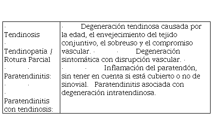 La tendinopatía, nombre colectivo para tendinitis, tendinosis y paratendinitis, es el síndrome clínico que describe las lesiones por uso excesivo del tendón. Se caracteriza por una combinación de dolor, inflamación difusa o localizada y pérdida de la función, daño térmico, y respuestas compresivas adaptativas(Suer & Abd-Elsayed, 2019). Se trata de una respuesta fallida a la curación, asociada a degeneración de las células tendinosas, desorden de las fibras de colágeno, aumento de la matriz celular sin colágeno junto con una inflamación neurogénica(Scott et al., 2015).