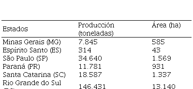Según los últimos datos disponibles, la producción nacional hoy está próxima a las 220.000 toneladas (Tabla 1). En Rio Grande do Sul se produce más del 66 % del total nacional, seguido por los estados de São Paulo, Santa Catarina, Paraná, Minas Gerais y Espírito Santo(31).