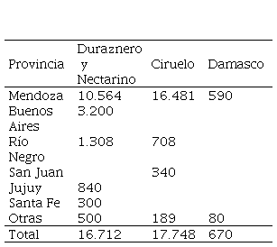 Mendoza, a pesar de que en los últimos 10 años ha sufrido una fuerte disminución de la superficie ocupada por frutales de carozo, sigue siendo la principal provincia productora con destino tanto a fruta fresca como industria, y concentra el 79 % del total nacional. Le sigue la provincia de Buenos Aires con el 9 % (Tabla 2).