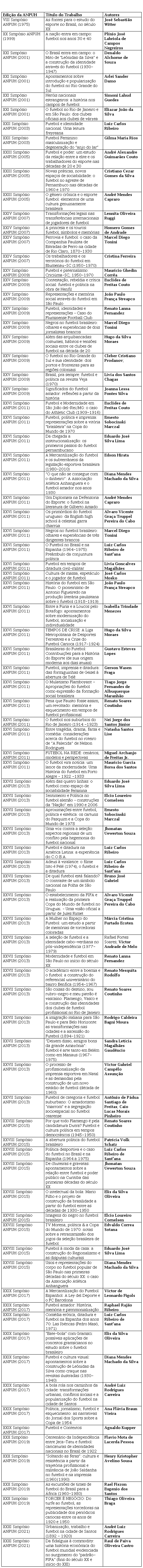 Com apenas dois trabalhos com essa temática entre os Simpósios de 1962 a 2001, é possível afirmarmos, com alguma segurança, que o futebol não despertou nesse período elã suficiente para ser apropriado como chave de leitura historiográfica. O propalado discurso de alargamento das fontes e dos objetos, herdado da Escola dos Annales, não alcança o futebol no desdobramento das muitas possibilidades abertas com o campo da História Cultural. Abaixo, apresentamos o quadro esquemático[4] com os 86 trabalhos encontrados: