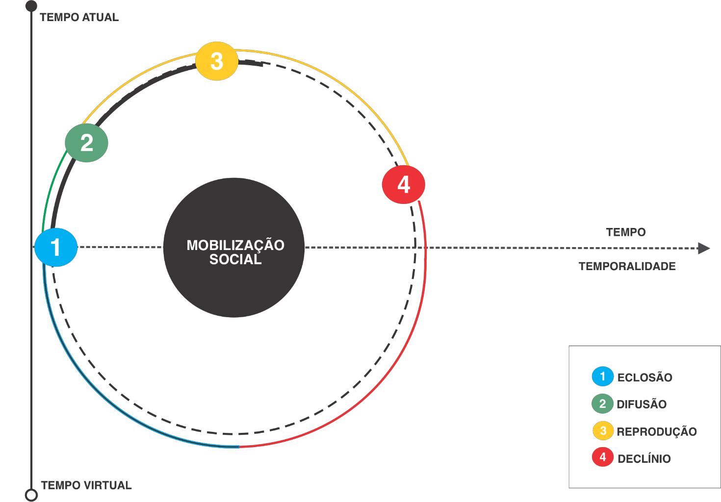 O quadrante de progressão de uma mobilização em rede (figura 4) demonstra as etapas e fases que a desencadeiam, e nessa linha, acena para as temporalidades que a constituem. Eclosão, difusão, reprodução e declínio apresentam um ciclo temporal entre o tempo atual e o virtual, originando uma temporalidade própria, como destaca a figura 5.
