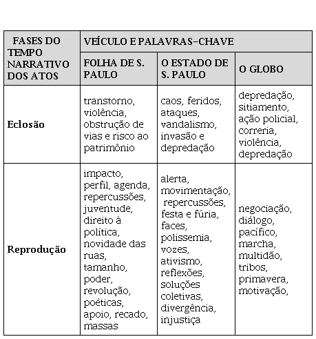Já a fase de reprodução acompanha um sobressalto narrativo ao destacar o caráter político e democrático dos atos, aventando-os como expressão de direitos civis e a necessidade democrática para sua constituição. A cobertura midiática, por sua égide e pujança de apuração jornalística, deteve a atenção para a criação de um tempo narrativo-factual por um período. Todavia, essa prerrogativa foi suplantada pela dinâmica das redes digitais usadas pelos próprios participantes nas ruas para criar sua própria linha temporal, disputando o que os noticiários emplacaram entre reportagens e manchetes.