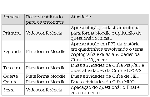 Com esse intuito, a pesquisa foi desenvolvida em cinco momentos descritos a seguir: O primeiro foi o estudo sobre pesquisas com temáticas no Ensino de Matemática, na qual foram investigado os documentos educacionais brasileiros e a pesquisa de Olgin (2015) quanto ao trabalho com temáticas no Currículo de Matemática do Ensino Médio. O momento seguinte foi a pesquisa sobre o conteúdo de matrizes e sua relação com o tema criptografia, bem com um levantamento histórico sobre o tema. O terceiro momento foi a elaboração de atividades que explorassem as cifras histórias, assim como códigos com o conteúdo de matrizes aliado ao tema, com a utilização de planilhas eletrônicas. O momento seguinte foi a aplicação das atividades com 6 alunos do 3° ano do Ensino Médio de uma escola da rede pública do munícipio de Montenegro/RS, de forma remota por meio da plataforma Moodle[10] e grupo no Whatsapp. E, no quinto momento, foi realizada a análise dos dados obtidos a partir dos questionários aplicados, registros escritos e arquivos salvos no software Excel enviados na plataforma Moodle pelos participantes.