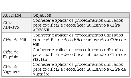 A seguir, são apresentadas as atividades elaboradas a partir da Cifra de Playfair e da Cifra MKO, que aborda a parte histórica e explora o conteúdo de matrizes, respectivamente.