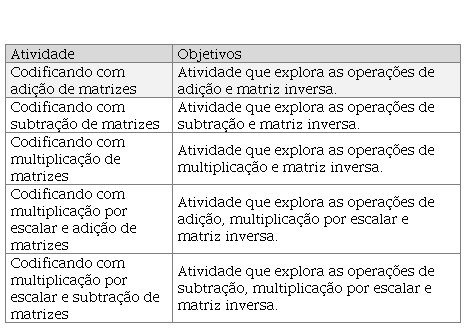As atividades apresentadas evidenciam a possibilidade de criar uma sequência didática que contextualiza a aplicação do conteúdo de matrizes com o tema criptografia e a utilização de planilhas eletrônicas.