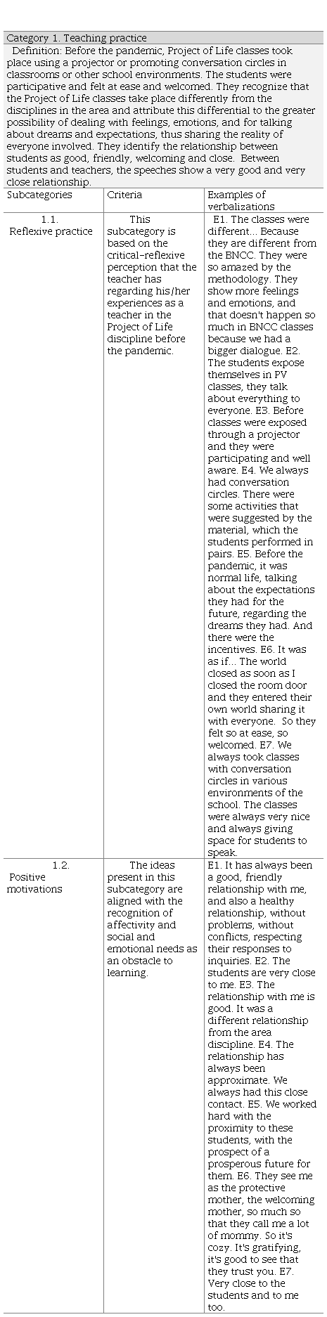 The results are presented below, discussed in the light of the literature data. Along the lines outlined, the interviews were applied, prescribed and analyzed. This study aimed to understand the impact of the COVID-19 pandemic in the context of social-emotional learning from the perspectives of teachers who teach the PV discipline in basic education.