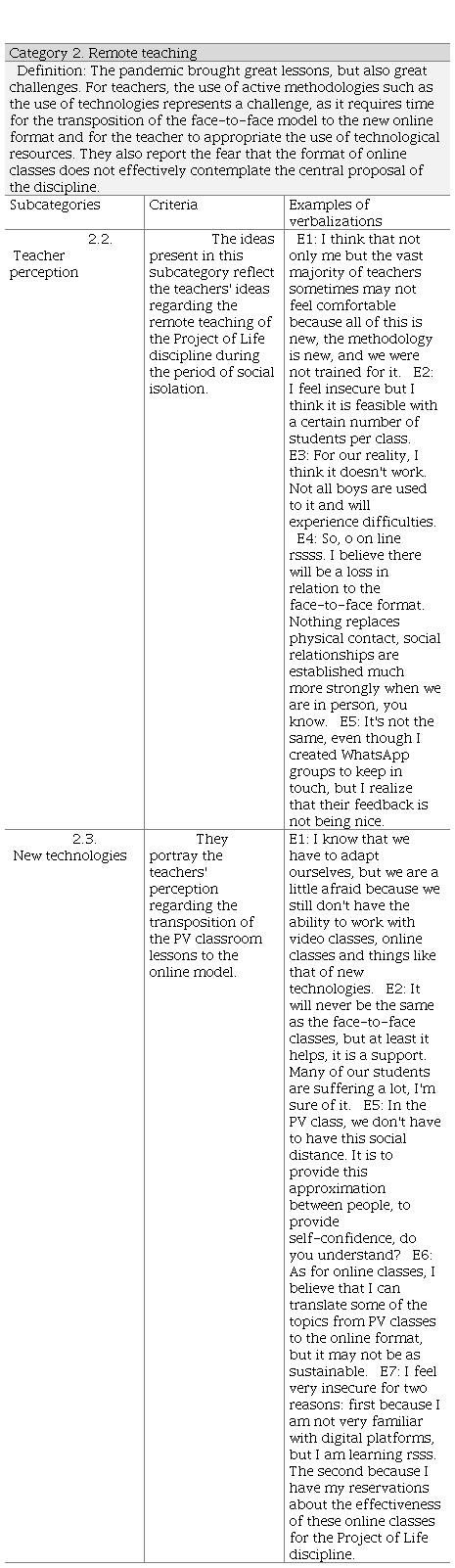 The subcategory “new technologies” expressively brings a portrait of the teachers' insecurity in transposing the face-to-face format of the Project of Life classes to a remote format. It is worth mentioning in their speeches the fear that the distance will compromise the structured pedagogical proposal for the themes addressed in the discipline, which generally favor collective dynamics that contribute so much to learning. Alberti et al., (2014) concluded that learning through group dynamics can take place not only at the theoretical level but also by being integrated with the ability to act in both known and unforeseen situations.