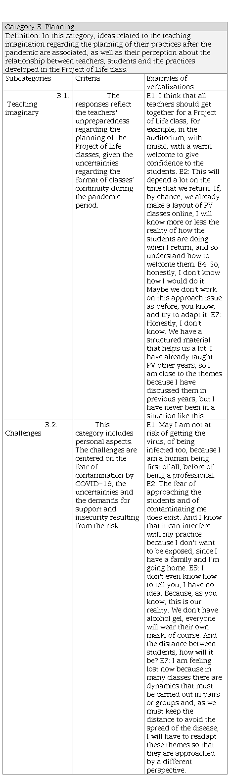 When considering that the current needs require the reinvention not only of the workplace but also of the teaching professional, the category planning was created. From the teachers' reports, aspects of the discourse emerged regarding the possibility of returning to face-to-face classes and the uncertainties about the didactic adaptations that would be necessary. The challenge of teaching a discipline with a different profile was evident, as the case of PV, due to the fear of contamination.