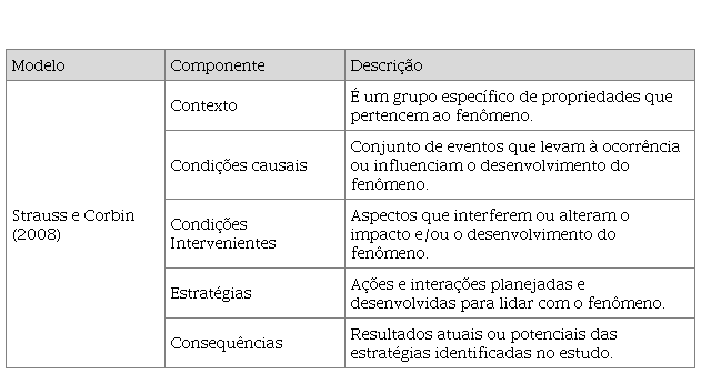 Para identificar a categoria central que engloba todas as demais, do fenômeno estudado, no caso, as aulas remotas, foi utilizado o modelo paradigmático proposto por Strauss e Corbin (2008). Esse modelo é composto por cinco componentes: contexto, condições causais, condições intervenientes, estratégias e consequências. No Quadro 1, apresentamos os componentes desse modelo acompanhados de sua descrição.
