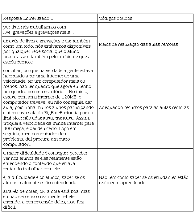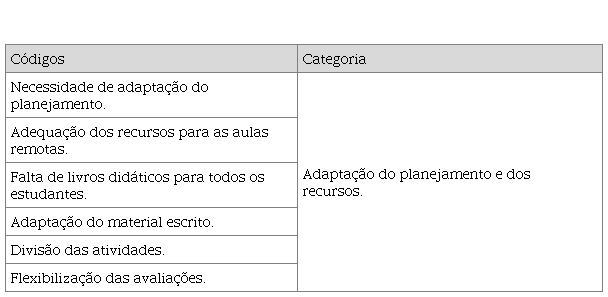 Além da categoria “Adaptação do planejamento e dos recursos”, no agrupamento dos códigos também foram evidenciadas as categorias “Dificuldade em saber se os estudantes estão aprendendo”, “Falta de acesso à internet”, “Meios de realização das aulas remotas”, “Participação não é integral” e “Comprometimento da aprendizagem”.