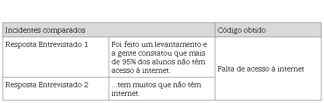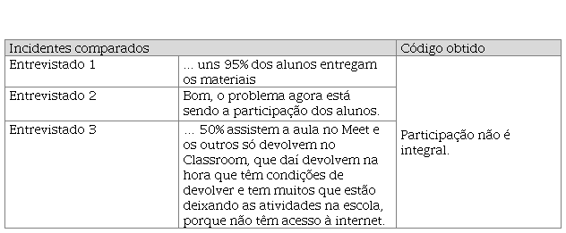A Entrevista 3 também foi transcrita, analisada e codificada, sendo comparados os incidentes dessa entrevista com os das demais. Um exemplo dessa comparação é apresentado no Quadro 4, com o qual é obtido o código “Participação não é integral”