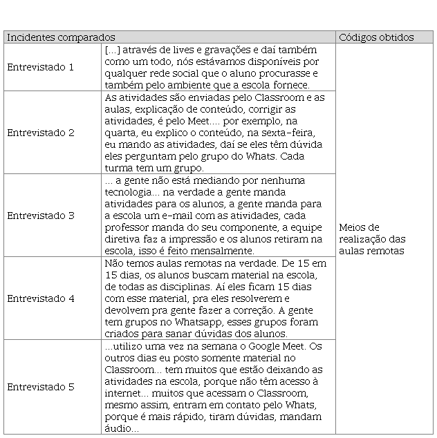 Na sequência, foram transcritas as Entrevistas 4 e 5 e foi realizada a comparação dos incidentes, visando identificar os incidentes que são representados pelo mesmo código (Quadro 5).