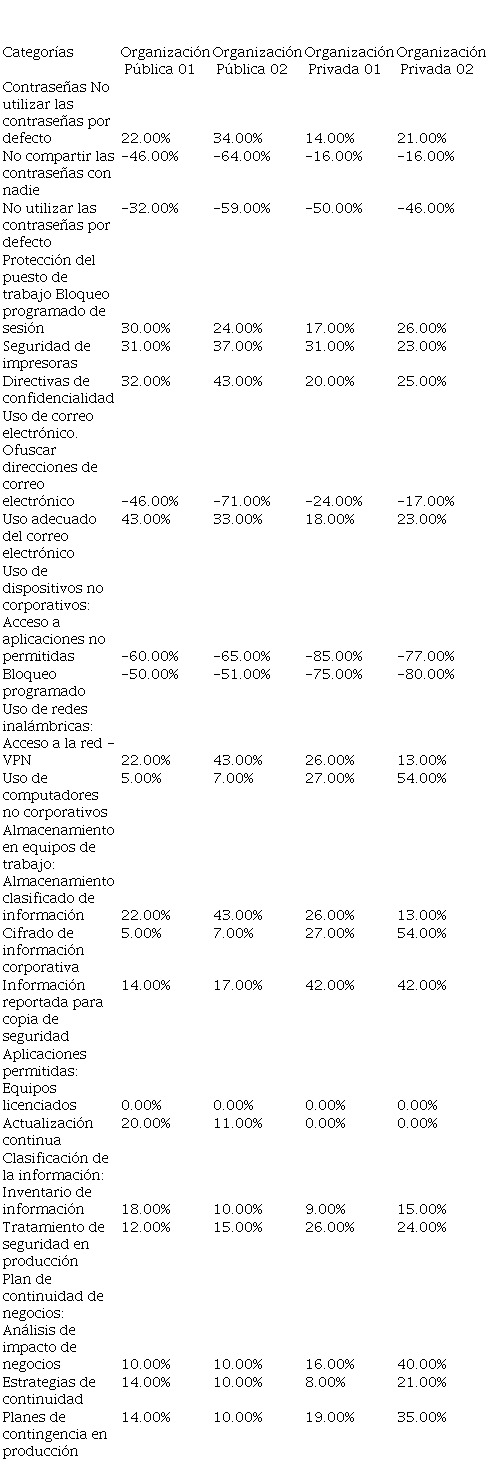 Se ha procedido a realizar evaluaciones bajo los criterios de seguridad de la información propuestos. Para esto se han estudiado 02 organizaciones públicas y 02 organizaciones privadas como escenario de acción. Se dispuso el análisis de la información de 09 controles de TI que son comunes a las organizaciones bajo estudio. El análisis de los controles de TI se estableció bajo las categorías que son comunes a las organizaciones con el fin de tener criterios similares para realizar un análisis organizado e integrado. La Tabla 1 presenta los porcentajes de incremento o decremento en la aplicación de los controles de seguridad formalizados.