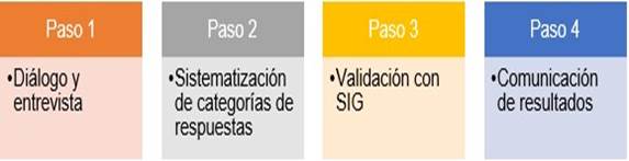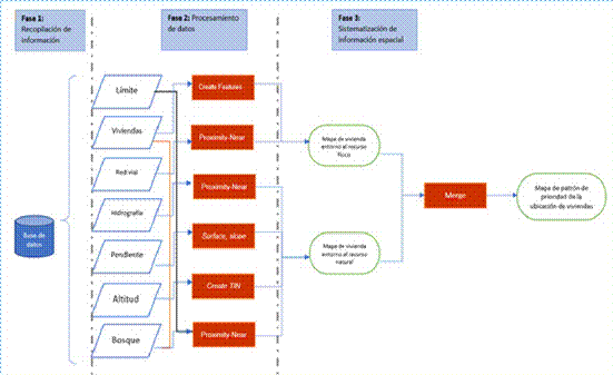 Para el paso 1, se identificó actores claves conformado por mujeres y varones y se dio inicio de manera individual el diálogo y entrevistas; en el paso 2 se sistematizó en categorías de respuesta (ver gráfico 2) a partir del diálogo y entrevistas seleccionando las palabras que se repitieron más de una vez, en el paso 3, las respuestas obtenidas en categorías de respuesta se validó con sistemas de información geográfica (SIG), cuyo proceso del análisis espacial de las viviendas siguió las fases que se muestra en el gráfico 1.