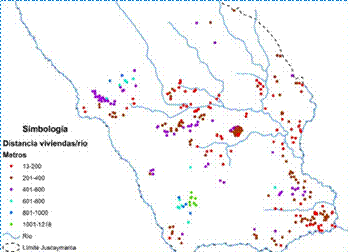 La distancia de las viviendas en relación a los ríos se calculó para tener una aproximación de medida, en el mapa 4 se representó las viviendas en diverso s colores dependiendo la distancia a los ríos, el color rojo marca las viviendas más cercanas al río y el color verde las más lejanas, tal como se muestra en la simbología.