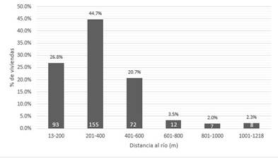 En 44.7% de las viviendas se encuentran entre 201 m y 400 m de distancia hacia a los ríos, esto representa 155 viviendas, siendo el mayor número de viviendas ubicadas a esta distancia. Mientras tanto el 2.3% que son 8 viviendas se encuentran entre 1001 m a 1218 m, que son considerados las más lejanas, sin embargo, estas a pesar de la lejanía al río, tienen muy cerca a un promedio de 50 metros los puquiales o sequias, en su defecto agua entubada y potable.