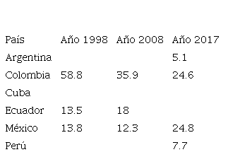 Diversos autores coinciden en que Latinoamérica es una de las regiones en donde se registra mayor presencia de delincuencia en el mundo (Briceño-León & Zubillaga, 2002a; Soares & Naritomi, 2010a).Por lo regular se utiliza el número de homicidios por cada 100,000 habitantes como un índice de prevalencia de la delincuencia y de la violencia en un país o una zona determinados. En la tabla 1 se presentan dichos índices para los países en donde se realizó el estudio. Tabla 1.