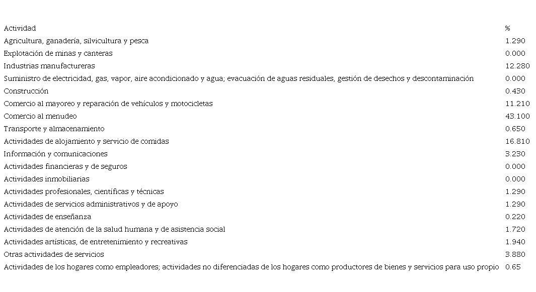 Además, 42.6% de los directores de la muestra es mujer, con una edad promedio de 41.6 años; el estado civil más representado es casado, con 54.2%. Respecto a la escolaridad, se encontró que 9.7% de los directores no cuenta con educación formal, 10.1% estudió primaria, 27.7% estudió secundaria, 34.6% estudió bachillerato, 16.8% terminó la licenciatura y el restante 1.1% tiene estudios de posgrado. Se estima que, en promedio, los directores dedican 8.78 horas a la semana a su negocio. En la tabla 1 se presentan las actividades a las que se dedican las empresas participantes en el estudio.