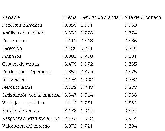 En la tabla 2 se presentan las medias de las escalas de las variables del análisis sistémico de la mype, así como su alfa de Cronbach por escala. Se puede observar que sólo la variable de satisfacción con la empresa tuvo un alfa de Cronbach menor a 0.75.