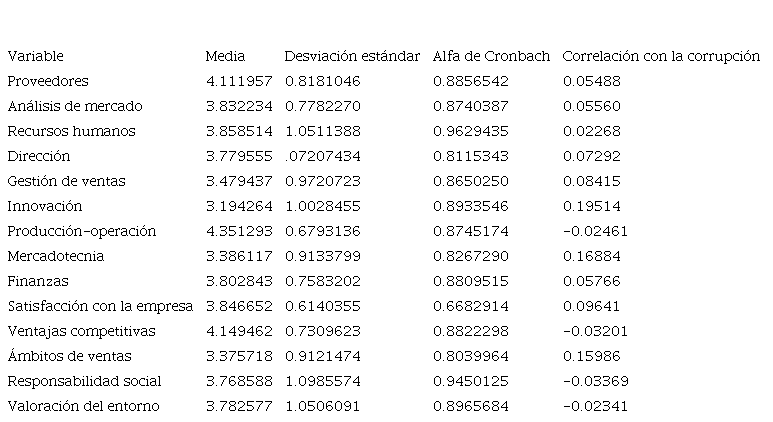 A continuación, se presenta la estadística descriptiva de las variables de estudio en la muestra de 465 mypes. Los datos fueron analizados en el programa R versión 3.6.1., usando el paquete psy versión 1.1 para el alfa de Cronbach.