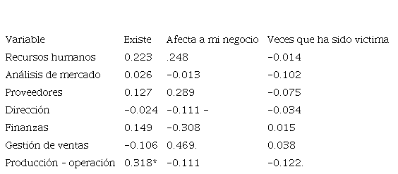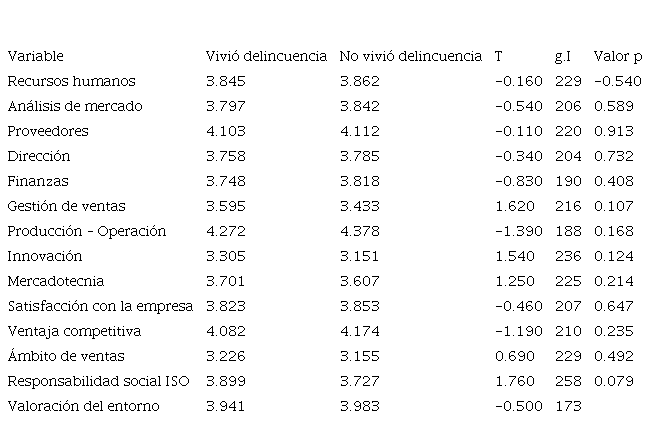 Para ponderar el efecto de la delincuencia y la corrupción en las estrategias de gestión, se harán dos análisis. Por un lado, se compararán las medias de los niveles de cada elemento del sistema presentados en la tabla, determinando si las empresas que fueron víctimas de la delincuencia y corrupción y presentan niveles diferentes de las empresas que no fueron víctimas. Por otro lado, se hace una regresión lineal para cada elemento del sistema en el que se valora el efecto de la percepción de delincuencia y corrupción, haber sido víctimas de la delincuencia-corrupción en los distintos componentes de la estrategia.