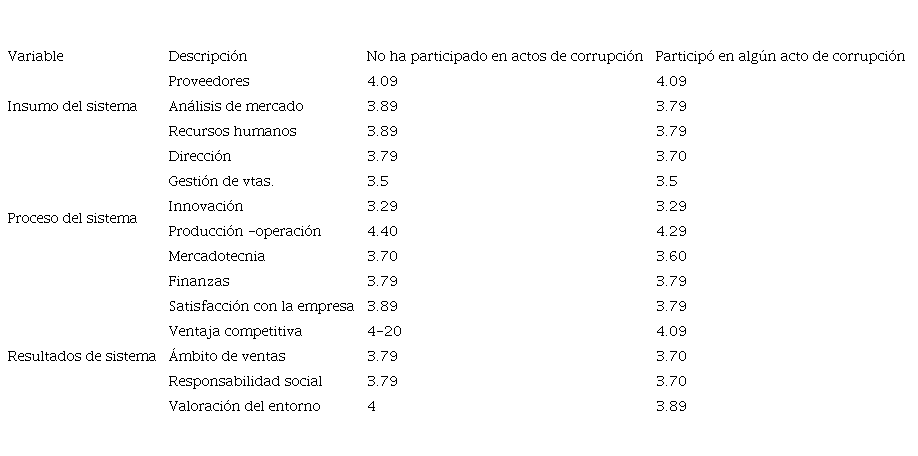 Por último, se presentan resultados del análisis sistémico por cada variable, en donde se ve la diferencia de medias de las empresas que mencionaron no haber participado en algún acto de corrupción versus las que si participaron tabla 6.