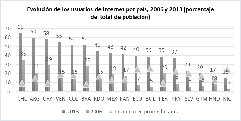 En América Latina y el Caribe, la Comisión Económica para América Latina y el Caribe (CEPAL) ha realizado diversos estudios sobre el internet y los usuarios, de acuerdo con esto, en el periodo 2006 – 2013 el número de usuarios aún no alcanza a la mitad de la población, mostrando una tasa de crecimiento en el periodo de 12%.