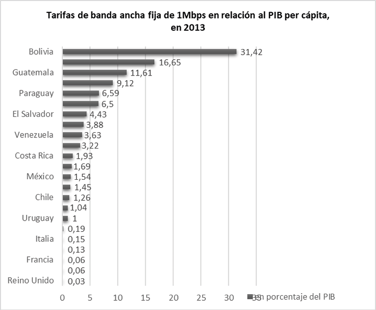 Para el mismo año, los costos de 1MB de internet eran superiores en los países en vías de desarrollo en comparación con los países desarrollados. El cálculo realizado con base en el porcentaje que ocupa el costo del servicio en relación al PIB Per Cápita de cada país muestra que en México se requiere del 1.5% de este PIB para adquirir 1MB de velocidad de internet para los usuarios.