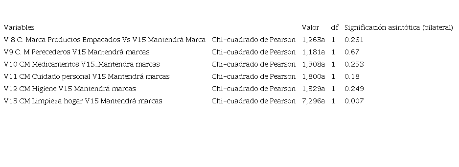 Así mismo, se encontró que el resultado de correlación mostrado de manera global, en relación a las marcas consumida en época de confinamiento y la continuidad de ellas después del confinamiento, no se presenta de la misma forma por cada una de las categorías evaluadas. En la categoría de Alimentos empacados de consumo en el hogar se obtuvo una significancia de 0,261. De igual manera en relación a Productos perecederos, tampoco existe una asociación estadísticamente significativa, en esta categoría ya que se obtuvo una significancia 0.670, con valores de significancia superiores del valor determinado de chi2 0,05.