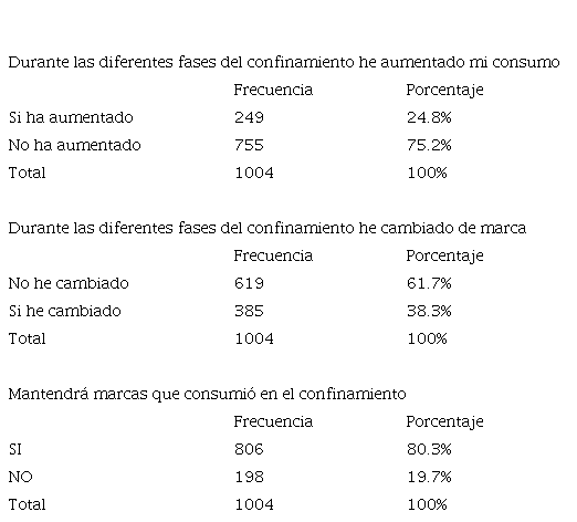 A través del análisis de frecuencias se encontró que una cuarta parte de los encuestados (24.8%) manifestaron que aumentaron el consumo de productos en general durante el confinamiento. Otro dato importante a resaltar fue que el 38.2% de las personas, cambiaron de marca durante este periodo, este dato es importante debido a que una tercera parte de las personas cambió de marca en el confinamiento, por lo que la lealtad que se tenía a las marcas habituales se vio amenazada en la contingencia sanitaria. Otro dato referente a la lealtad es que el 19.7% de ellos van a comprar las nuevas marcas compradas, estos resultados son muy significativos para las empresas, porque durante el confinamiento las personas dejaron de ser leales a las marcas que compraban cotidianamente, y tuvieron que recurrir a marcas sustitutas, que ahora compraran de manera habitual (ver tabla 2).