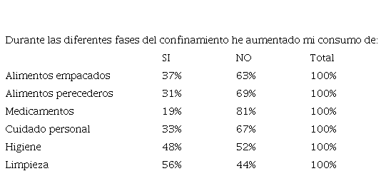 Al realizar el análisis por categoría de producto, se observó de manera especial, el aumento en el consumo de productos para limpieza (56%), y también un alza significativa en productos de higiene (48%), estos resultados están muy relacionado con los hábitos de bioseguridad que a nivel mundial promovieron los gobiernos, medidas que aún siguen vigentes después de dos años y, por las diferentes mutaciones que ha tenido el virus. Cabe destacar que, aunque también hubo mayor difusión de productos medicinales para mejorar el sistema inmunológico, este aumento en el consumo, no se vio reflejado en los resultados del estudio (ver tabla 3).