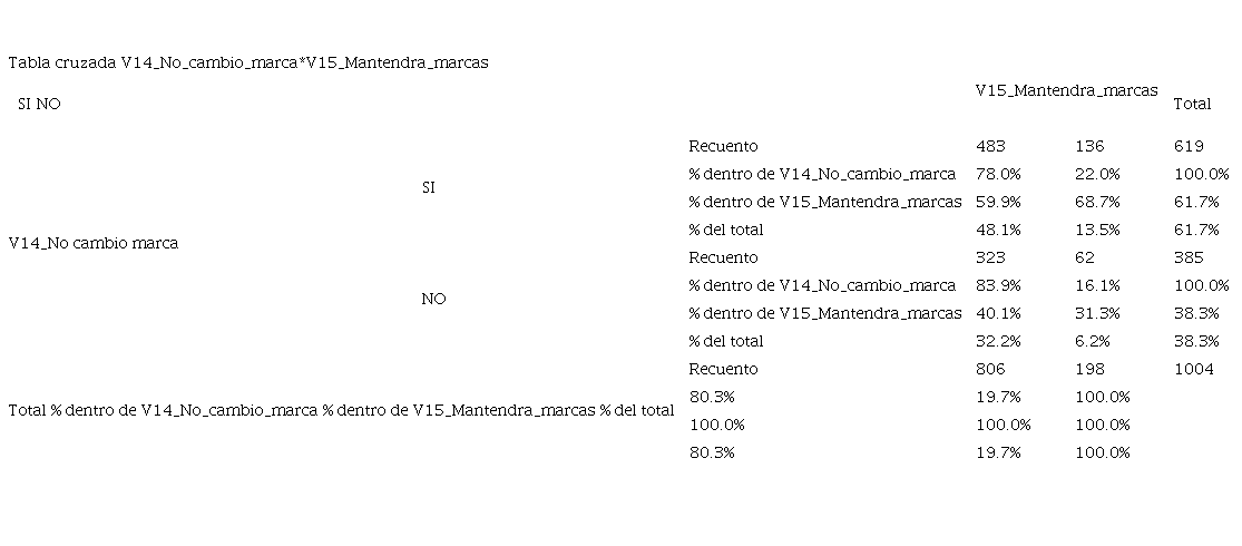 Con la finalidad de aceptar nuestra hipótesis: Existe correlación estadísticamente significativa entre las marcas consumidas por las personas durante el confinamiento provocado por la pandemia del COVID-19, y la continuidad del consumo de esas marcas después del confinamiento. Se llevó a cabo el análisis estadístico a través de la prueba chi2 con un nivel de significancia P: 0,05, Encontrando que en lo referente al análisis general de las categorías se obtuvo un resultado de significancia 0,023, menor al valor de prueba, encontrando que existe correlación estadísticamente significativa entre las marcas compradas durante el periodo de confinamiento por el COVID- 19 en México y que los encuestados continuaran con la compra y uso de las marcas utilizadas cuando se regrese a la nueva normalidad , los resultados se muestran en la tabla 4.