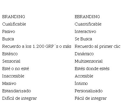 Viendo el éxito que se podía alcanzar debido a los medios digitales, el eBranding ha ido cobrando notoriedad. De esta forma, (Vallet, 2005), realizando un estudio tanto de branding como de eBranding, propone una clara diferenciación entre ambos conceptos, plasmando en la siguiente tabla No. 1, las cualidades que los componen: