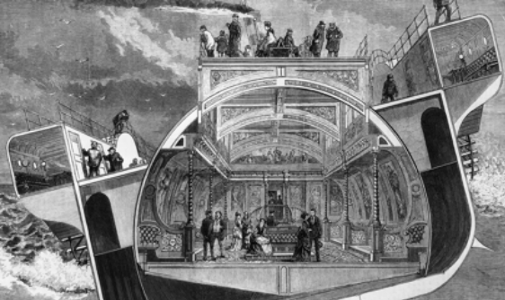 La dificultad que todo viajero reprochaba insaciablemente era la enfermedad del mar: el mareo. Hubo innumerables quebraderos de cabeza para desterrar las náuseas durante el viaje. El ingeniero británico, Sir Henry Bessemer, diseñó un vapor cuyos salones y pasillos se balanceaban al ritmo de las ondulaciones para lograr una estabilización. Sin movimientos veleidosos, los viajeros podrían realizar cualquier acción con naturalidad, inclusive leer. El SS Bessemer sólo fue la suma de una buena intención y dos colisiones. (Grabado en madera de J. R. Brown (1874), reproducido de The Graphic: An Illustrated Weekly Newspaper, Dec. 12, 1874, p. 572).